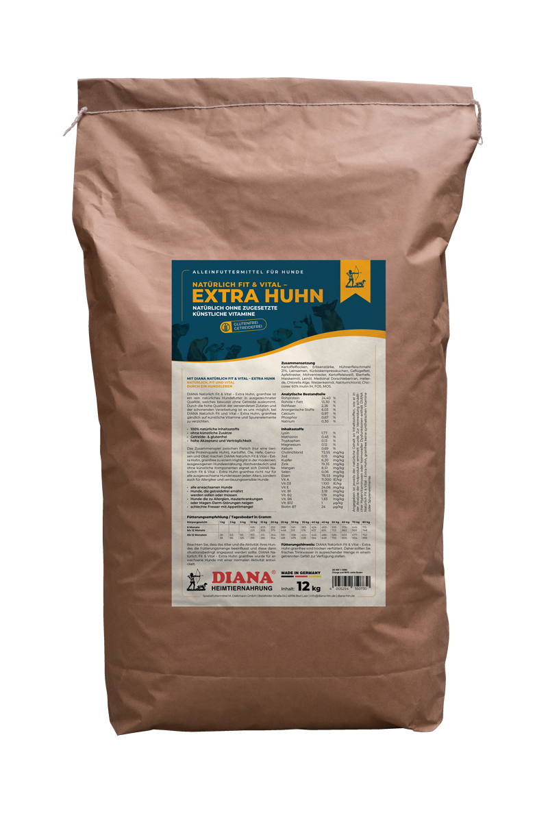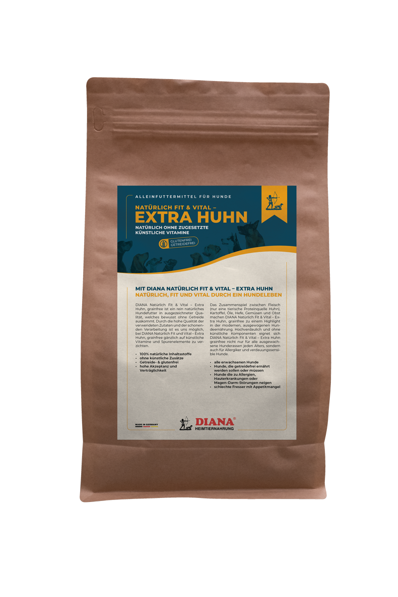 DIANA Natürlich Fit & Vital – Extra Huhn ist ein rein natürliches Hundefutter in ausgezeichneter Qualität, welches bewusst ohne Getreide auskommt. Durch die hohe Qualität der verwendeten Zutaten und der schonenden Verarbeitung ist es uns möglich, bei DIANA Natürlich Fit und Vital - Extra Huhn gänzlich auf künstliche Vitamine und Spurenelemente zu verzichten.
