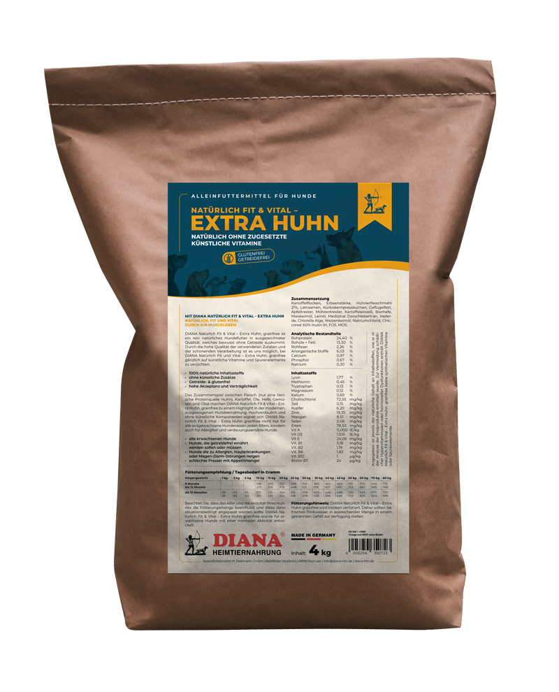 Bitte beachten Sie, dass das Alter und die Aktivität Ihres Hundes die Fütterungsmenge beeinflusst und diese dann Situationsbedingt angepasst werden sollte. DIANA Natürlich Fit & Vital - Extra Huhn, grainfree
